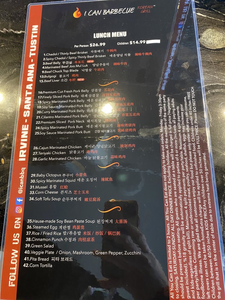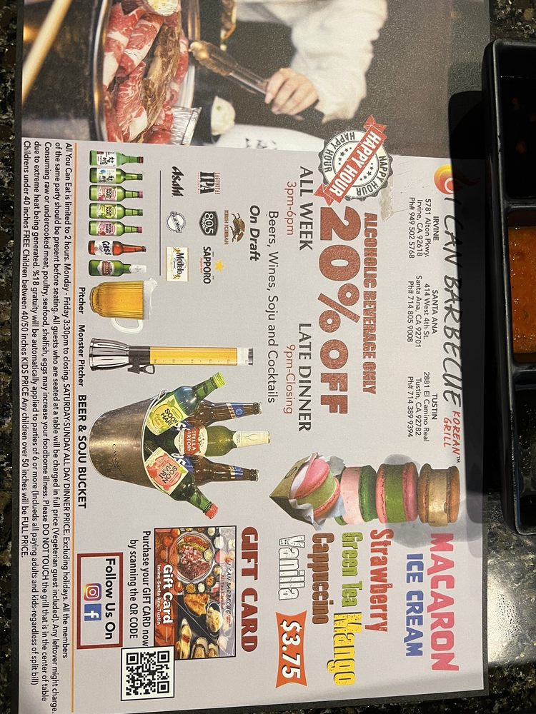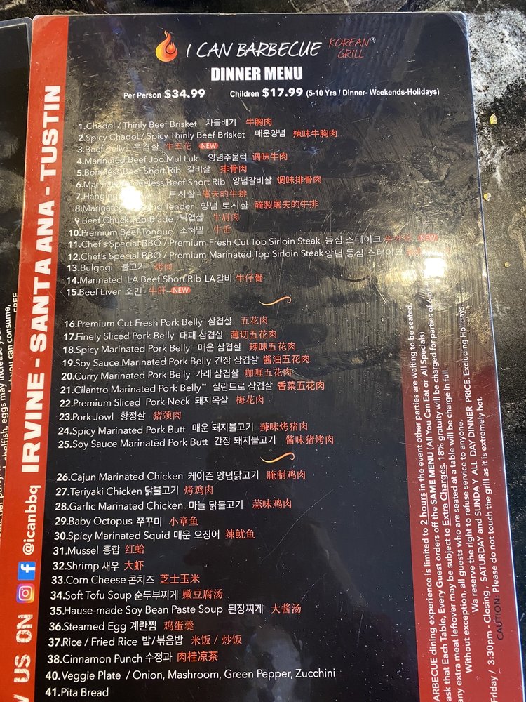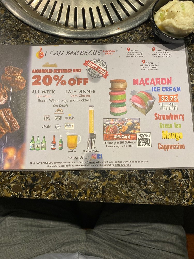 "I Can Barbecue -Tustin" offers a unique dining experience with a DIY concept, where customers cook their meals on a built-in table element. The menu includes a variety of marinated meats like LA Galbi, Bulgogi, Brisket, Teriyaki Chicken, and more served with rice and salad. The side dishes, including Kimchi, Radish, and Cucumber, complement the main dishes perfectly. Customers rave about the quality of the meat and the efficient service, with robot waiters delivering food to tables. The restaurant is spacious, clean, and offers a fun atmosphere with modern amenities like QR code ordering and robot service. Whether you're a KBBQ enthusiast or trying it for the first time, "I Can Barbecue -Tustin" promises a memorable dining experience.